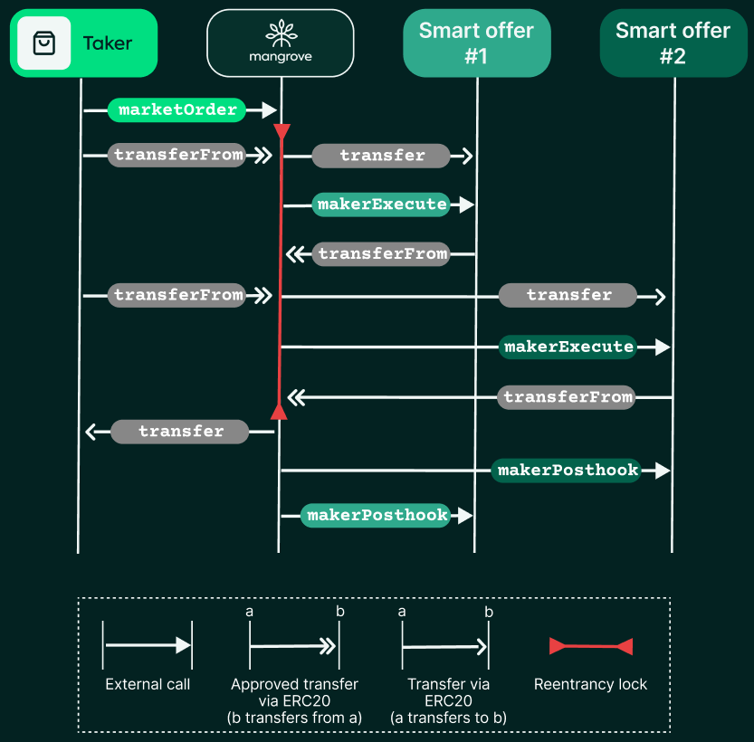 As drawn, the call sequence diagram depicts a situation where the funds for the smart offer are available directly on the maker contract holding the offer logic. However, for more advanced smart offers several smart contracts may come into play when liquidity is sourced.