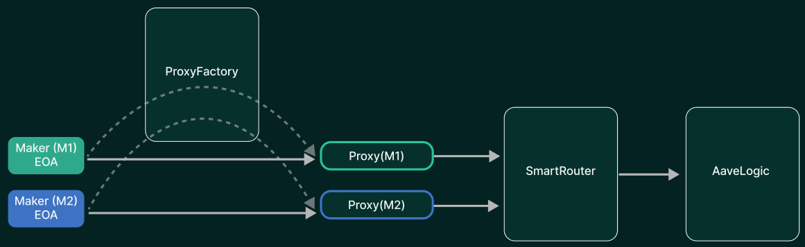 When requested to do so, the ProxyFactory deploys a RouterProxy. It is created specifically for the caller, and will forward all the push/pull calls to the SmartRouter, which forward those to the corresponding routing logic (ex: AaveLogic).